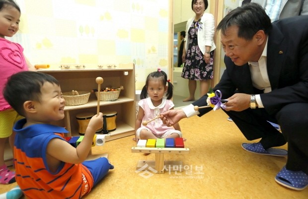 [시민일보]금천구(구청장 차성수)는 지난 18일 가산동 대륭테크노타운 12차에 들어선 구립 라온어린이집의 개원식을 개최했다. 사진은 차성수 금천구청장이 라온 어린이집 원생들과 같이 놀고있는 모습.