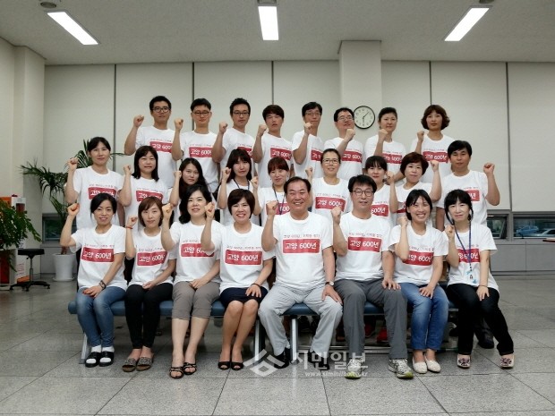 사진은 '고양 600'년 로고가 박힌 티셔츠를 입고 있는 직원들의 모습.
