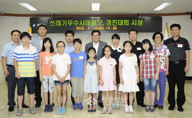 [시민지난 18일 오후 2시 서울 광진구청 기획상황실에서 ‘쓰레기 제로화 우수사례 공모전’과‘공동주택 음식물류폐기물 감량 경진대회’의 시상식이 열렸다.사진 김기동 구청장(가운데)과 수상자들의 모습.