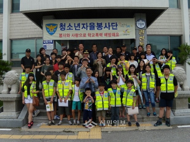 지난 20일 고양시 관산동 자율방범대는 오후 2시에 동 주민센터 2층 회의실에서 ‘관산동 청소년 자율봉사대 발대식’을 개최하였다. 사진은 자율봉사대 발대식 후 기념촬영 하는 모습.