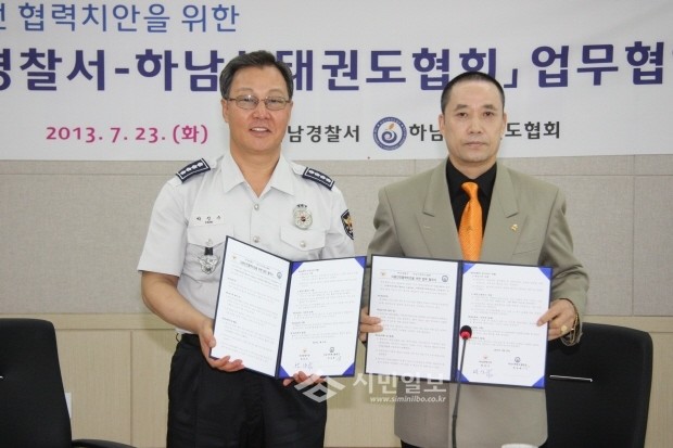 지난 23일 아동보호 사회안전망 구축 및 협력 치안 강화를 위해 하남시태권도협회와 업무협약을 체결하였다.이날 행사는 경찰서장 및 태권도협회 임원진 등 24명이 참석한 가운데 4대 사회악 중 스스로를 보호할 능력이 부족한 아동들을 유괴 및 성폭력 범죄로부터 보호하기 위한 업무 협약식을 열었다.