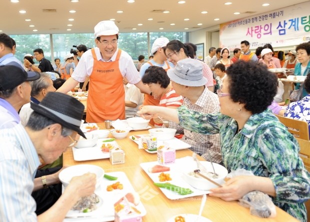 유덕열 동대문구청장은 23일 시립 동대문노인종합복지관에서‘중복맞이 사랑의 삼계탕 나눔 행사’에 참여해 배식봉사활동을 펼쳤다. 사진은 유덕열 동대문구청장이 삼계탕 배식봉사활동을 하고 있는 모습.