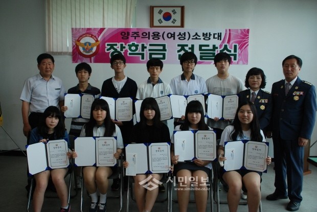 [시민일보]경기 양주소방서(서장 우근제) 양주의용소방대는 어려운 환경에서도 학업에 충실해온 학생에게 장학금(총 300만원)을 전달했다고 24일 밝혔다. 사진은 장학금을 받은 학생들이 기념촬영을 하고 있는 모습.