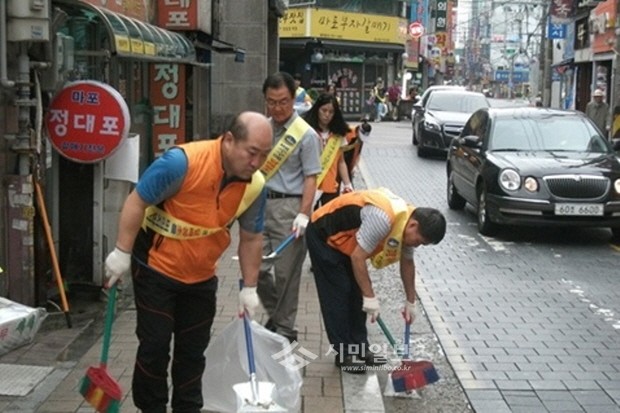 [시민일보]서울 마포구가 지난 24일 서울클린데이를 맞아 이른 아침부터 각 동에서 지역주민·자율청소 참여단체·점포주 및 기업체·민간단체 등이 참여해 길거리 대청소를 실시했다. 사진은 도화길을 청소하고 있는 모습.