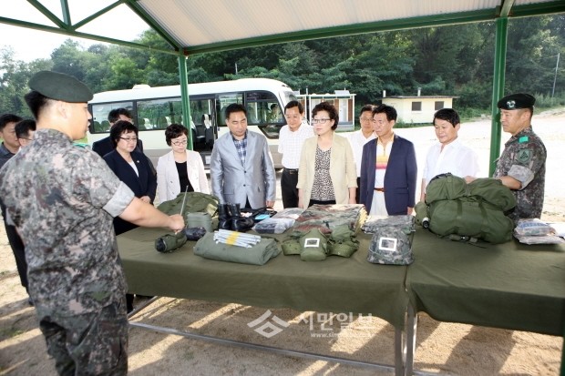 지난 25일 서울 강북구의회 의장과 의원6명 등 15명이 육군 제2188부대 220보병연대 2대대를 방문해 일일 병영체험 행사를 했다. 사진은 의원들이 군인들에게 지급되는 장비설명을 듣고 있는 모습.