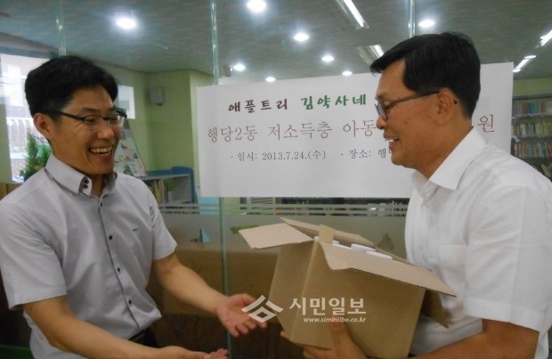 서울 성동구(구청장 고재득)는 성수동 소재 기업‘애플트리 김약사네’가 지난 24일 행당2동 주민센터에 저소득층 가정 아동 150명을 위한 비타민 종합영양제를 기증했다. 사진은 강원태 애플트리 팀장(왼쪽)이 김윤호 행당2동장(오른쪽)에게 종합영양제를 기증하는 모습.