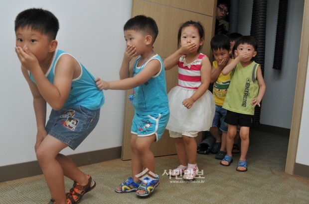 서울 은평소방서는 29일 시민안전체험교실에서 해오름 어린이집 원생 및 지도교사 등 17명을 대상으로 주택화재예방 소방안전교육을 실시하였다. 사진은 열·연기 대피훈련장 건물내부 탈출체험을 하는 아이들의 모습.