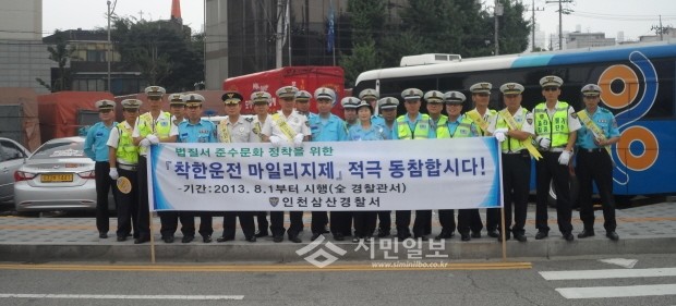 8일 인천삼산경찰서는 인센티브를 제공하는 좋은 제도「착한운전 마일리지제」의 성공적 추진을 위해 부평구 부평5동 부흥로타리에서 캠페인을 가졌다. 사진은 삼산경찰서 교통안전계 직원들과 삼산모범운자회가 플렌카드를 들고 켐페인을 하고있는 모습.