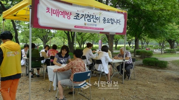 최근 동작구는 주민들의 통행이 많은 병원·아파트·역·공원·등 직접 주민들을 찾아 치매 조기검진을 실시했다. 사진은 보라매공원에 설치된 현장검진소를 찾은 주민들이 치매검진을 받고있는 모습.