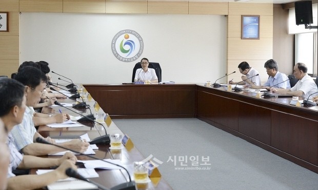 인천시교육청은 12일 시범학교에서 2학기부터 시작되는 자유학기제를 두고 간부회의를 개최해 세부방안에 대해 논의했다. 사진은 영상회의실에서 구자문 부교육감이 업무보고를 듣고 있는 모습.