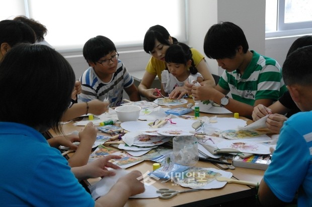 동두천시종합자원봉사센터 수호천사가족봉사단은 지난 10일 두드림 희망센터에서 요양원에서 더운 여름을 지내는 노인들을 위한 냅킨부채 250개를 만들었다. 사진은 냅킨부채를 만들고 있는 가족의 모습.