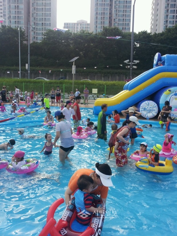 [시민일보]중랑구는 지난달 3일, 중랑천 야외수영장을 개장했다. 이 수영장은 개당 후 일 평균 1600명이 방문하며 주민들의 휴양지로 활용되고 있다. 성인풀, 어린이풀, 미끄럼틀과 함께 샤워장을 비롯한 다양한 편의시설도 설치되어 있다. 900여명까지 동시에 입장이 가능하다. 사진은 지난 11일 수영장을 찾은 주민들의 모습.