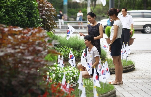 동대문구가 제68주년 광복절을 맞아 지난 14일 구청 앞 광장 푸른 화단에 대형 태극기 2기와 100여개의 소형 태극기로 조성한 한반도 모양의 태극기 동산을 조성했다. 사진은 동대문구청 직원들이 태극기 동산에 태극기를 꽂고 있는 모습.