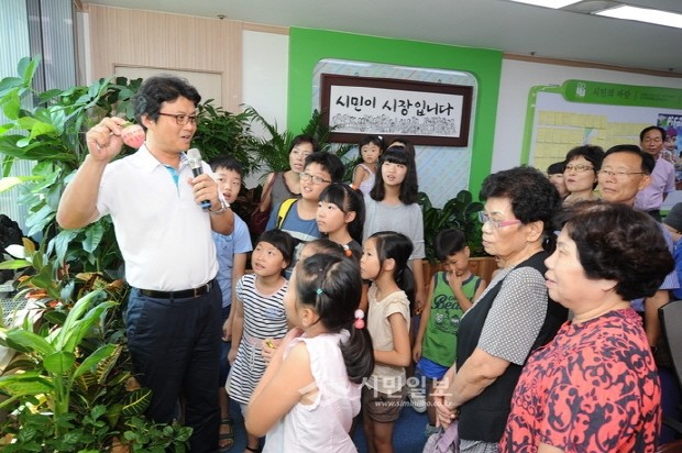 [시민일보]지난 14일 경기도 부천시청(시장 김만수)에서, 10여 명의 성인문해학교 학생, 방학을 맞은 초등학생, 일반 신청자 등 23명을 대상으로 부천시청투어가 열렸다. 사진은 김만수 시장이 시청내부를 설명하고 있는 모습.