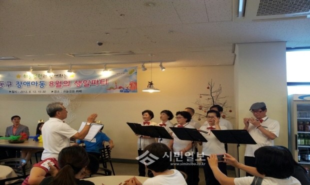 [시민일보]최근 서울 강동구는 성내동에 위치한 ‘하늘정원 뷔페’에서 지적·발달장애인으로 구성된 ‘강동구장애인부모회’ 회원들과 생일을 맞은 장애아동들을 위한 파티가 열렸다. 사진은 생일파티에서 축가를 부르고있는모습.