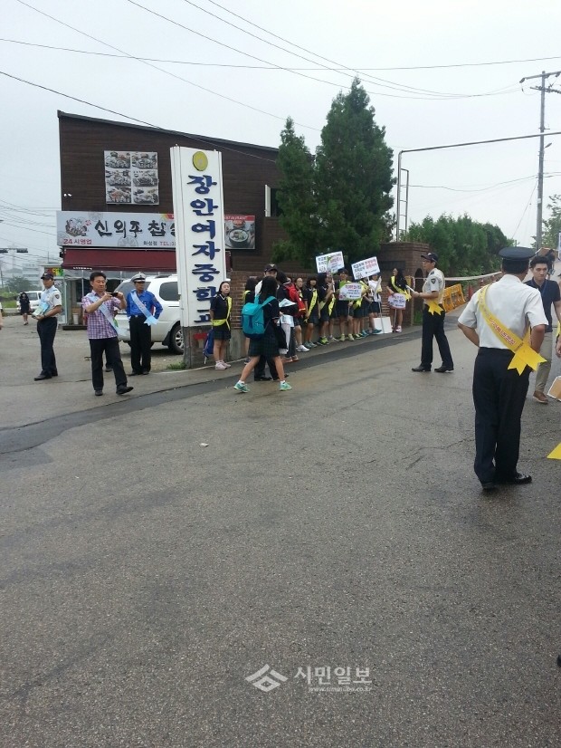 경기 화성서부경찰서는 지난19일 개학을 맞은 학교를 대상으로 장안면사무소장 및 공무원 10여명, 장안여자중학교 교장 및 교직원, 장안여자중학교 학생 및 학부모 등 총 100여명이 학교폭력범죄예방 캠페인을 실시했다. 사진은 개학일 학교 정문에서 캠페인을 펼치고 있는 모습.