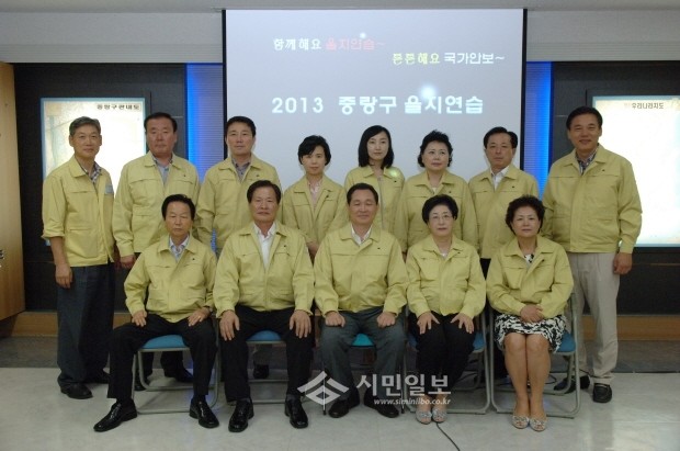 지난 19일 서울 중랑구의회(의장 김근종) 전체의원은 구청 을지연습상황실을 방문해 훈련상황을 참관하고, 관계공무원과 군부대 장병 등 훈련 참가자들을 격려했다. 을지연습 참관 후 기념촬영을 하고 있는 의원들의 모습.