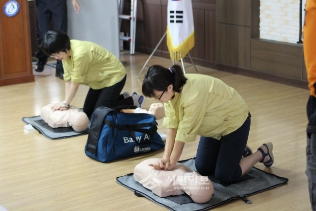 충남 아산교육지원청(교육장 이선영)은 20일 을지연습 상황실에서 응급환자 발생시 대응능력 향상을 위한 응급처치 및 심폐소생술 교육을 직원들을 대상으로 실시했다. 사진은 을지훈련 2일차 응급상황시 심폐소생술 과정을 실습하고 있는 모습.