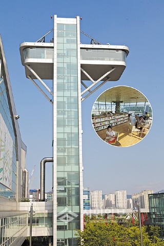 21일 경기 성남시 분당구 삼평동 판교환경에너지시설 굴뚝인 판교크린타워(높이 58m) 내 전망대에 설치한 북카페에서 시민들이 책을 읽고 있다. /사진=성남시 제공