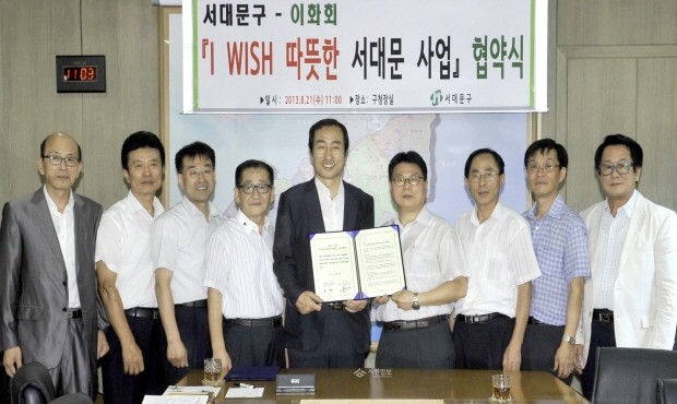 지난 21일 서대문구가 구청장실에서 남대문 지역 안경 도매유통업체 대표모임 이화회와 ‘I Wish 따뜻한 서대문 사업’ 협약을 맺었다. 사진은 문석진 서대문구청장(가운데)이 협약을 맺고 관계자들과 기념촬영을 하고 있는 모습.