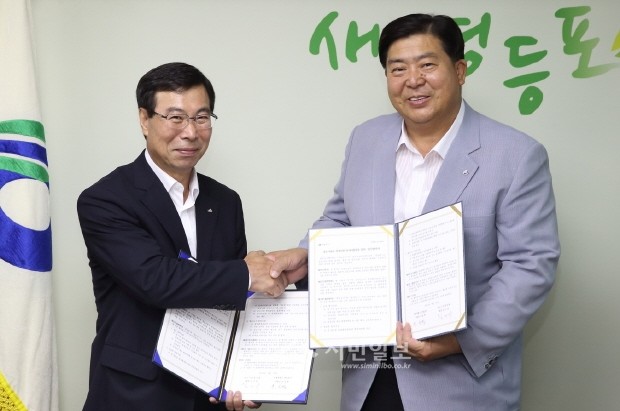 지난 23일 영등포구가 중장년층의 지속적인 일자리를 마련과 취업지원을 위한 정보공유를 위해 중소기업중앙회와 업무 협약식을 맺었다. 사진은 조길형 영등포구 구청장과 중소기업중앙회 김제락 인력지원본부장이 협약식을 맺는 모습.