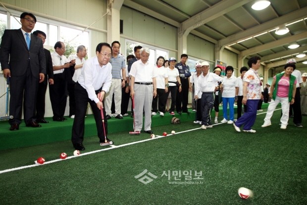 | ▲ 23일 경기 용인시 공설운동장내 실내게이트볼장에서 '제5회 처인구 게이트볼한마음대회'가 열렸다. 사진은 대회에 참석한 김학규 시장이 게이트볼을 하고있는 모습. | ||