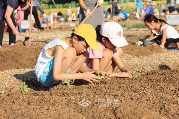 [시민일보]지난 24일, 성동구 행당동 76-3번지 일대에 1인당 12평방미터의 공간을 활용할 수 있는 '성동 무지개 텃밭'이 개장했다. 사진은 텃밭에서 모종을 심고 있는 어린이들의 모습.
