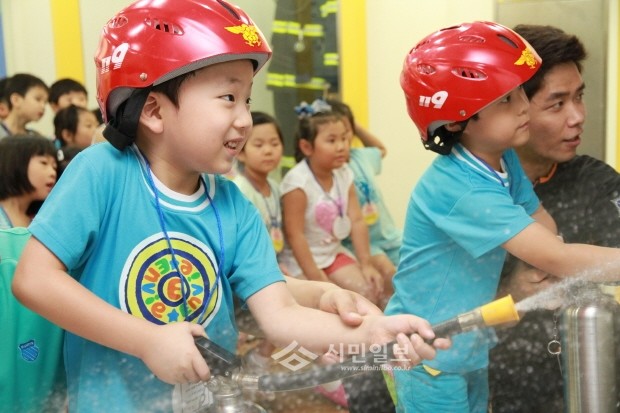 서울 구로소방서는 26일 광명시 철산동 소재 '은별유치원'을 대상으로 어린이들의 자기 보호능력과 유사시 재난대처능력을 향상시키기 위해 ‘119 여름학교 소방대장’ 체험학습을 운영했다. 사진은 아이들이 '가상화제 진화체험'을 하는 모습.