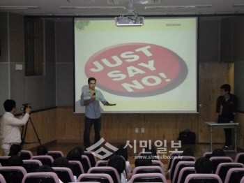 | ▲ 지난 5월 20일 성수중학교에서 학생들의 금연을 위한 강의와 체험이 결합된 WE 프로그램의 일환으로 전문 강사가 금연에 관한 교육을 실시하고 있다. | ||