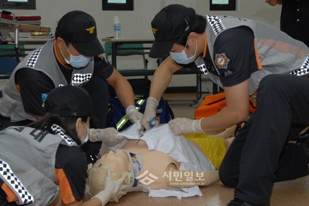 26일 경기 광주소방서는 34개 소방서 직원이 참여한 ‘광주소방서, 경기도 소방관서중 기술경연대회‘에서 최우수상을 수상했다. 사진은 구급대원들의 환자처치 능력을 테스트하는 모습.