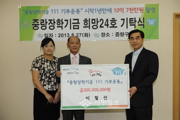 27일 중랑구청장실에서 독지가 이필선(가운데)씨가 중랑구의 교육발전을 위해 써달라며 중랑장학기금 2억원을 기탁하고, 문병권 중랑구청장(오른쪽)과 기념촬영을 하고 있다.
