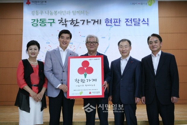 서울 강동구는 27일 구청 대강당에서 매출액의 일정액을 사회에 기부하고, 나눔을 몸소 실천하는 소상공인의 가게52곳을 대상으로 “착한가게, 나눔으로 함께하는 곳”이라고 표기된 현판을 전달했다. 사진은 이해식 강동구청장과 착한가게 대표들의 현판식 기념촬영하는 모습.