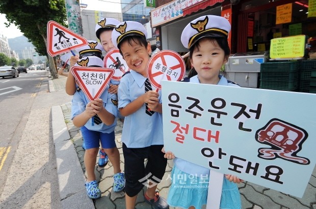 지난 8월30일 동대문구 장평교, 장안동 일대에서 어린이 교통사고를 줄이기 위한 교통안전 캠페인이 열렸다. 사진은 캠페인에 참여한 어린이들이 경찰복장을 하고 홍보활동을 하는 모습.