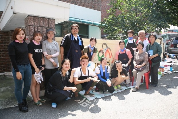 강동구가 추진하는 '강풀만화거리' 조성이 완료돼 3일에 성내2동, 오는 6일에 천호3동에서 준공식을 연다. 사진은 지난 8월13일 성내2동 벽화그리기 현장에 자원봉사로 참여한 만화가 강풀, 구청장 이해식, 자원봉사자들의 모습.