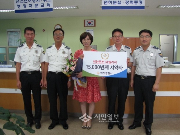 아산경찰서는 지난 8월30일 착한운전 마일리지 시행 후 약 한 달만에 나온 1만5000번째 서약자에게 기념품을 증정하는 축하행사를 열었다. 사진은 기념품 증정행사 후 기념촬영을 하고 있는 모습.