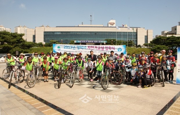 2일 평택시가 자전거의 조작ㆍ점검ㆍ수리방법 등에 대해 매주 2회 교육하는 '2013 하반기 평택시 자전거 교실' 입학식을 열었다. 사진은 행사에 참여한 김선기 평택시장과 자전거교실 수강생들의 모습.