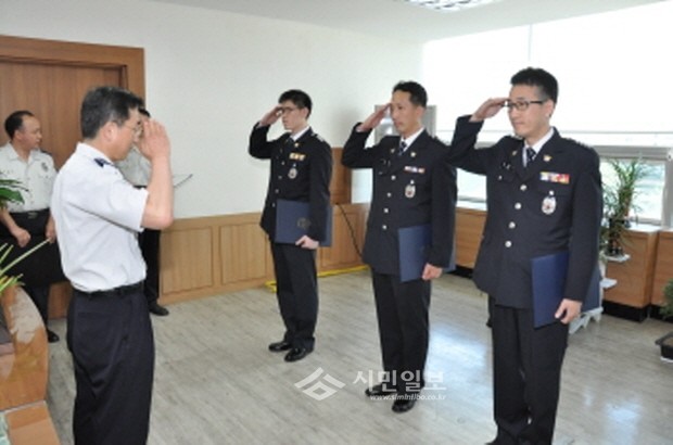 지난 2일 인천삼산경찰서는 형사과 경사 이형재 등 3명에 대한 승진임용식을 가졌다. 사진은 임용식에서 임명장을 받고 경례를 하고있는 승진자들의 모습.