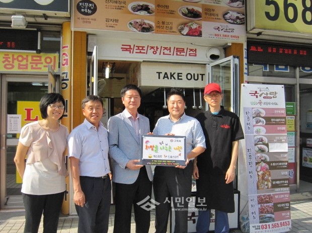[시민일보]경기 구리시가 인창동 '국사랑' 구리사랑점과 위·드림스타트 60호 후원기관 협약식을 체결해 취약계층 아동들에게 따뜻한 국을 제공하기로 했다. 이로인해 국사랑 구리사랑점은 앞으로 구리시 취약계층 아동들에게 사랑이 담긴 국 20팩을 매달 정기적으로 후원하게 된다. 사진은 협약식후 가계앞에서 기념촬영 하는 모습.