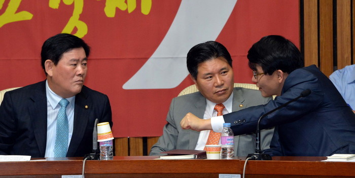 3일 오전 서울 여의도 국회 245호 회의실에서 열린 원내대책회의에서 윤상현 원내수석부대표가 최경환 원내대표, 홍문종 사무총장과 주먹을 쥐고 이야기하고 있다.