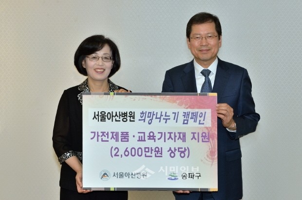지난 2일 서울 송파구에 서울아산병이 지역 소외계층의 주거와 교육환경을 개선하기 위해 2600만원 상당의 기금과 물품을 전달했다. 사진은 전달식 후 박춘희 송파구청장(왼쪽)과 아산병원원장이 기념촬영을 하는 모습.