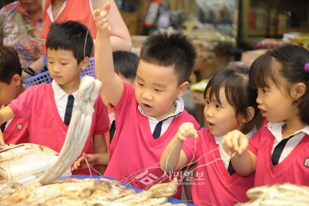 지난 3일 오전 중랑구 망우동 우림시장에서 어린이들이 전통시장을 더욱 친숙하게 느끼고 시장 이용 방법을 익히도록 하기 위해 '전통시장 장보기 체험'이 진행됐다. 사진은 체험 도중 식재료를 들어보는 어린이들의 모습.