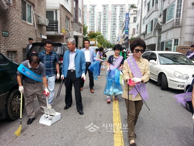 지난 5일 용인시 수지구 풍덕천2동은 추석을 앞두고 교통량이 많은 대로변을 중심으로 불법 현수막, 전신주에 붙어 있는 스티커, 광고물, 잡초 제거 등 마을 대청소를 실시했다. 사진은 시의원, 통장협의회, 주민자치위원회, 체육회, 새마을부녀회, 예비군동대, 직원 등 60여명이 도로 주변을 청소하고 있는 모습.