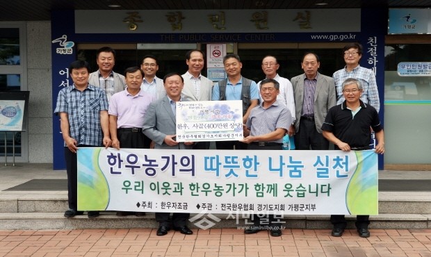 [시민일보]지난 6일 가평군 한우연합회가 추석을 맞아 군청을 방문해 어려운 이웃들에게 전달해 달라며 한우(불고기) 124kg, 사골 156kg 등 총 400만원 상당의 한우를 기증했다. 사진은 한우 기증 후 협회와 군청직원이 기념촬영을 하는 모습.