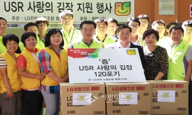 [시민일보]경기 LG전자 노동조합 평택1지부는 지난 6일 LG전자 평택디지털파크 대식당에서 김장김치 120포기를 담가 홀몸노인 60가구에 전달했다. 사진은 LG전자 노동조합원과 평택시복지위원회 위원들이 김치를 전달하기 전 기념촬영 하는 모습.