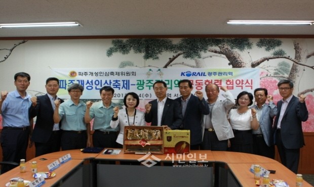 [시민일보]최근 경기 파주시는 광주역에서 파주개성인삼축제 추진위원회와 코레일 간에 1회 제3땅굴, 도라산역, 도라전망대 등 안보관광과 연계하는 관광열차를 운행하는 협약을 체결했다. 사진은 협약식 후 기념촬영 모습.