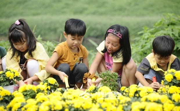 [시민일보]서울 광진구는 9일 중랑천 둔치에서 어린이집 원아 30여명이 가을꽃을 직접 심고 가꾸며 자연의 소중함을 느끼는‘고사리 손으로 가을꽃 가꾸기’ 행사 실시했다. 사진은 중랑천 둔치 유휴공간에서 지역 내 어린이집 원아들이 국화, 해바라기 등 가을꽃을 심고 있는 모습.