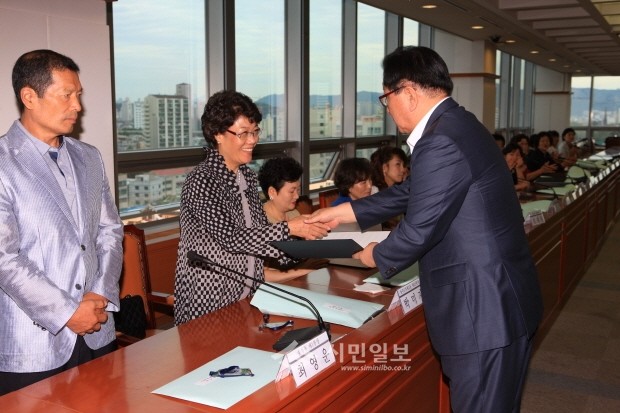 지난 6일 성동구는 2013 4분의 3분기 통장 위촉식을 열어 49명의 통장에게 위촉장을 수여하고 마을 복지 도우미로서 일해줄 것을 당부했다. 사진은 위촉식에 참여한 고재득 구청장과 통장들의 모습.