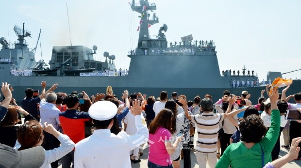 [시민일보]청해부대 14진 '최영함'(DDH-Ⅱ, 4400t급)이 9일 오전 해군작전사령부 부산작전기지에서 가족과 장병들의 환송을 받으며 출항하고 있다. 지난 6진에 이어 두 번째 파병길에 오르는 최영함은 10월 초 소말리아 아덴만에 도착, 내년 2월까지 파병임무를 수행한다. /사진=해군작전사 제공