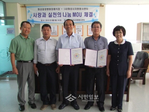 지난 9일 경기 화성시 중앙병원장례식장은 자원봉사센터와 등록자원봉사자와 직계가족에게 가정의 장례편의성 제공 및 장례식장 이용시설 사용총액 30%의 할인 혜택을 주는 양해각서(MOU) 협약식을 했다. 사진은 협약식 후 기념촬영 하는 모습.