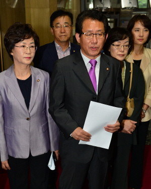 국회 교육문화체육관광위원회 민주당 간사인 유기홍(왼쪽 네번째) 의원을 비롯한 야당 교문위원들이 11일 오전 서울 종로구 세종로 정부서울청사에서 '우(右)편향' 논란을 일으킨 교학사 역사교과서 검정 통과에 항의하기 위해 교육부로 함께 향하던 중 취재진의 질문에 답변을 하고 있다.